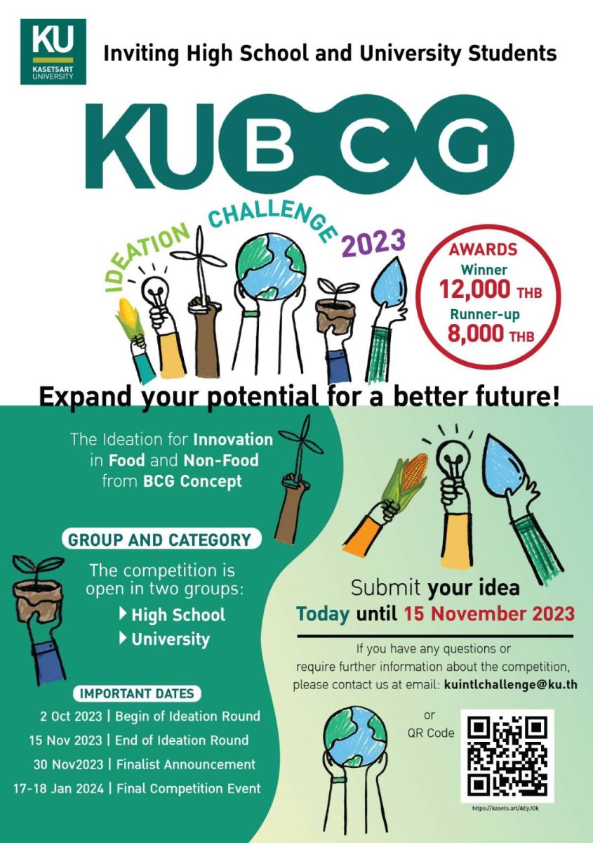 เชิญชวนนักศึกษาสมัครเข้าร่วมประกวด KU BCG Ideation 2023 ในรูปแบบออนไลน์ ซึ่งเป็นการประกวดนำเสนอแนวคิด (ด้วยภาษาอังกฤษ) ที่สร้างสรรภายใต้กรอบ BCG Model ที่มุ่งเน้นพัฒนาเศรษฐกิจ 3 มิติไปพร้อมกัน คือ เศรษฐกิจชีวภาพ เศรษฐกิจหมุนเวียน และเศรษฐกิจสีเขียว เปิดรับสมัครตั้งแต่บัดนี้ จนถึงวันที่ 15 พฤศจิกายน 2566