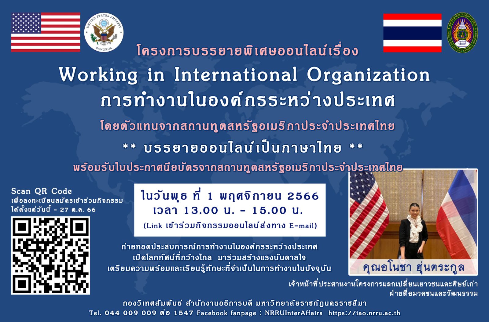 กิจกรรมการบรรยายพิเศษออนไลน์จากสถานทูตสหรัฐอเมริกาประจำประเทศไทย เรื่อง Working in International Organization การทำงานในองค์กรระหว่างประเทศ บรรยายในวันพุธที่ 1 พฤศจิกายน 2566 เวลา 13.00-15.00 น.