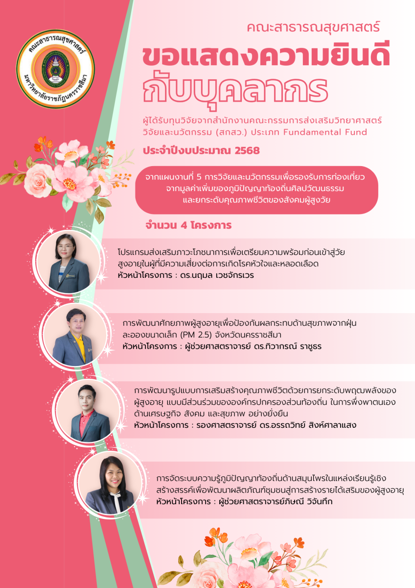 คณะสาธารณสุขศาสตร์ ขอแสดงความยินดีกับบุคลากรผู้ได้รับทุนวิจัยจากสำนักงานคณะกรรมการส่งเสริมวิทยาศาสตร์ วิจัยและนวัตกรรม (สกสว.) ประเภท Fundamental Fund ประจำปีงบประมาณ พ.ศ. 2568จากแผนงานที่ 5 การวิจัยและนวัตกรรมเพื่อรองรับการท่องเที่ยว จากมูลค่าเพิ่มของภูมิปัญญาท้องถิ่น ศิลปวัฒนธรรม และยกระดับคุณภาพชีวิตของสังคมผู้สูงวัย จำนวน 4 โครงการ