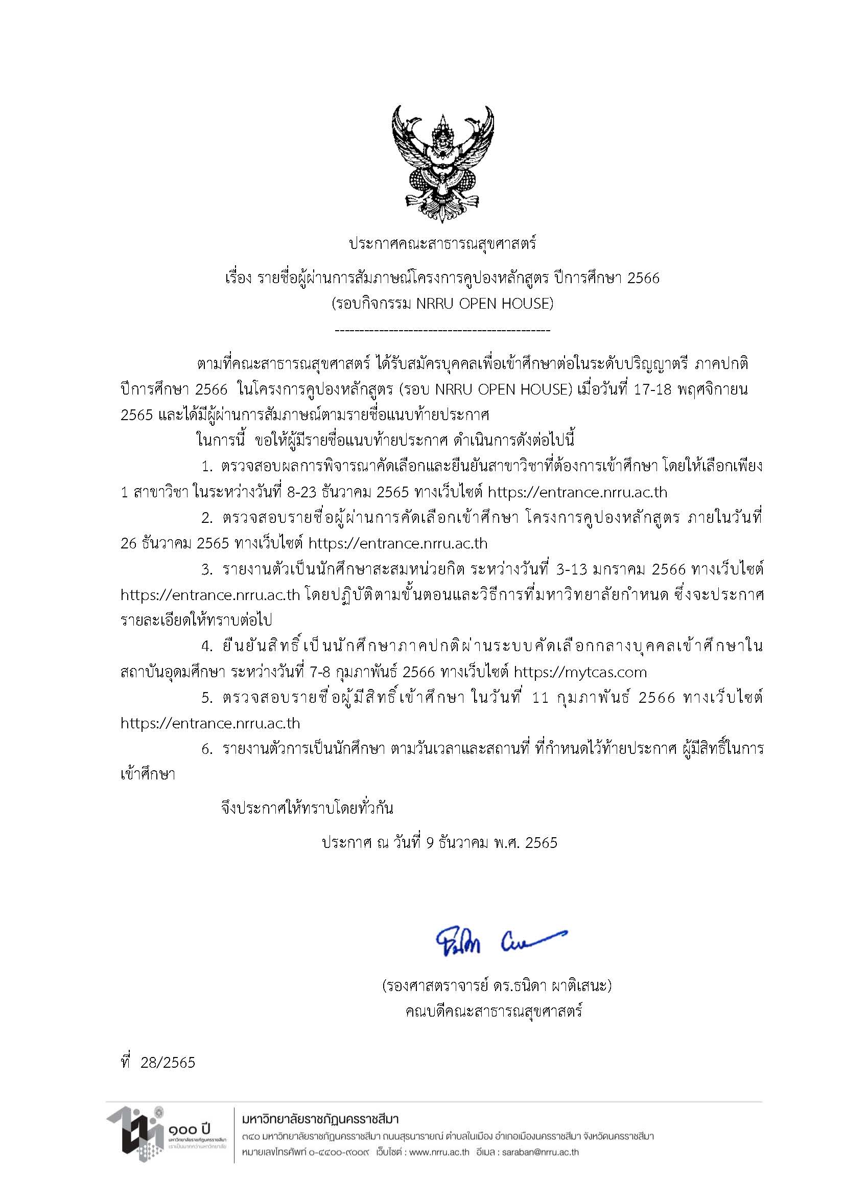 ประกาศคณะสาธารณสุขศาสตร์ เรื่อง รายชื่อผู้ผ่านการสัมภาษณ์โครงการคูปองหลักสูตร ปีการศึกษา 2566 (รอบกิจกรรม NRRU OPEN HOUSE)