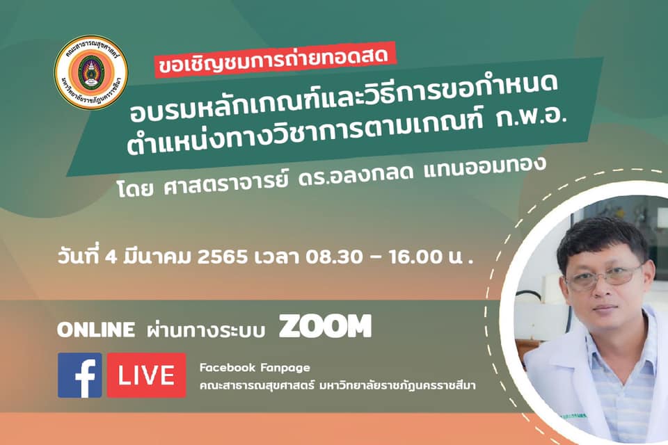 ขอเชิญเข้าร่วมการอบรมหลักเกณฑ์และวิธีการขอกำหนดตำแหน่งทางวิชาการที่สูงขึ้น ตามเกณฑ์ประกาศ กพอ. โดย ศาสตราจารย์ ดร. อลงกลด แทนออมทอง ในวันที่ 4 มีนาคม