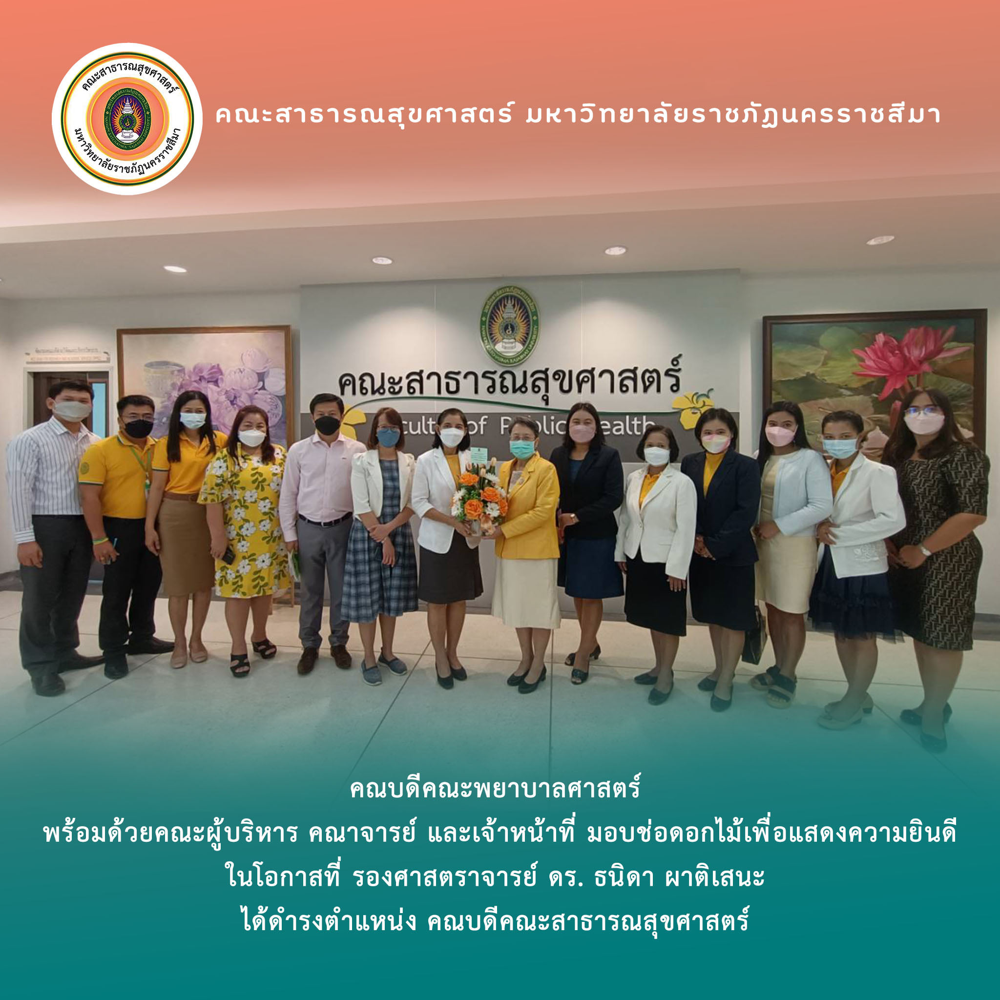 รศ.ดร. ธนิดา ผาติเสนะ คณบดีคณะสาธารณสุขสศาสตร์ พร้อมด้วยผู้บริหาร และบุคลากรคณะสาธารณสุขศาสตร์ ร่วมมอบกระเช้าแทนความขอบคุณให้แด่ ท่าน ผศ. ดร.สวียา ปรารถนาดี ชาติวิวัฒนาการ รองอธิการบดี มหาวิทยาลัยราชภัฏนครราชสีมา