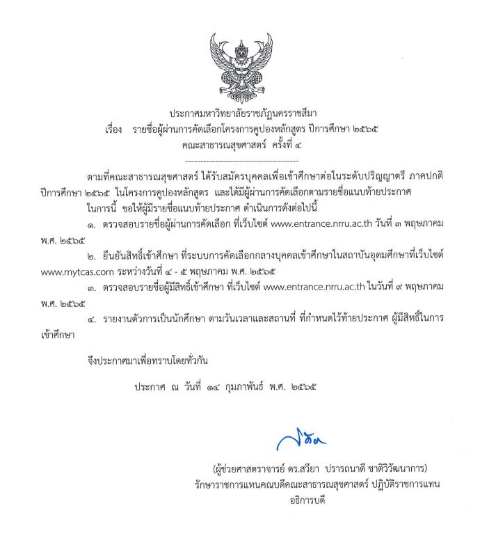 ประกาศรายชื่อผู้ผ่านการคัดเลือกโครงการคูปองหลักสูตร ปีการศึกษา 2565 คณะสาธารณสุขศาสตร์ ครั้งที่ 4