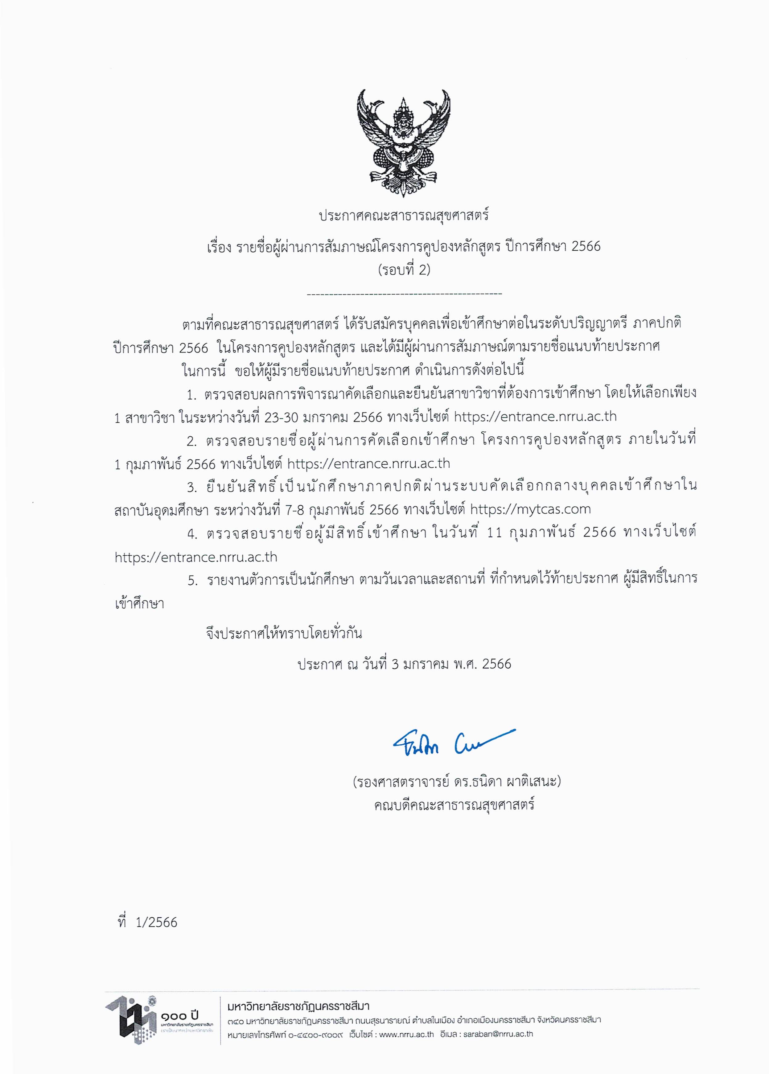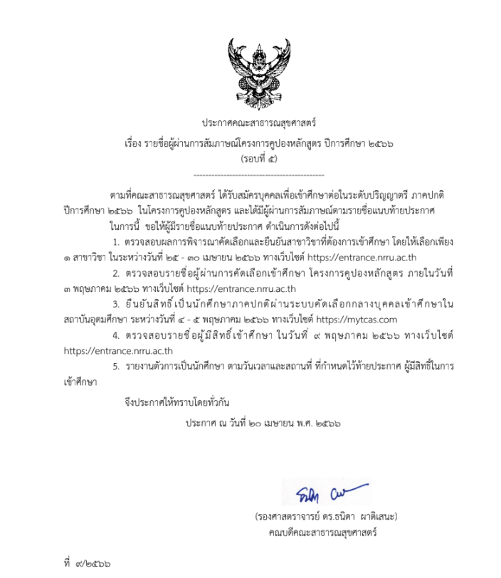 ประกาศคณะสาธารณสุขศาสตร์ เรื่อง รายชื่อผู้ผ่านการสัมภาษณ์โครงการคูปองหลักสูตร ปีการศึกษา 2566 (รอบที่ 5)